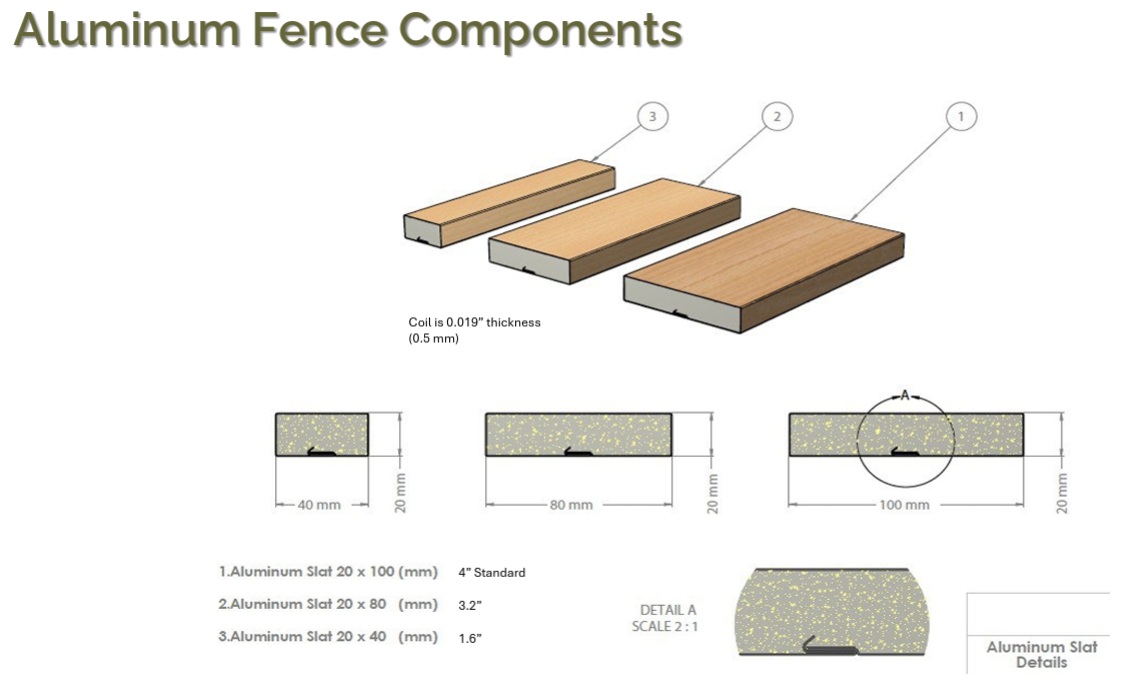 Fence and gates come with 4″ horizontal slats, which is different than the black, gray and white colors on the previous page. (1.6″ & 3.2″ slats are shown below, but are not stocked. Plan for 10-12 week turn-around on those). The Semi-Private sections come with 15mm spacers (which is just over 9/16″) between them. Privacy sections are 4″ slats as well, but are not Tongue & Groove. We can upgrade for maximum ‘privacy plus’ upon request.